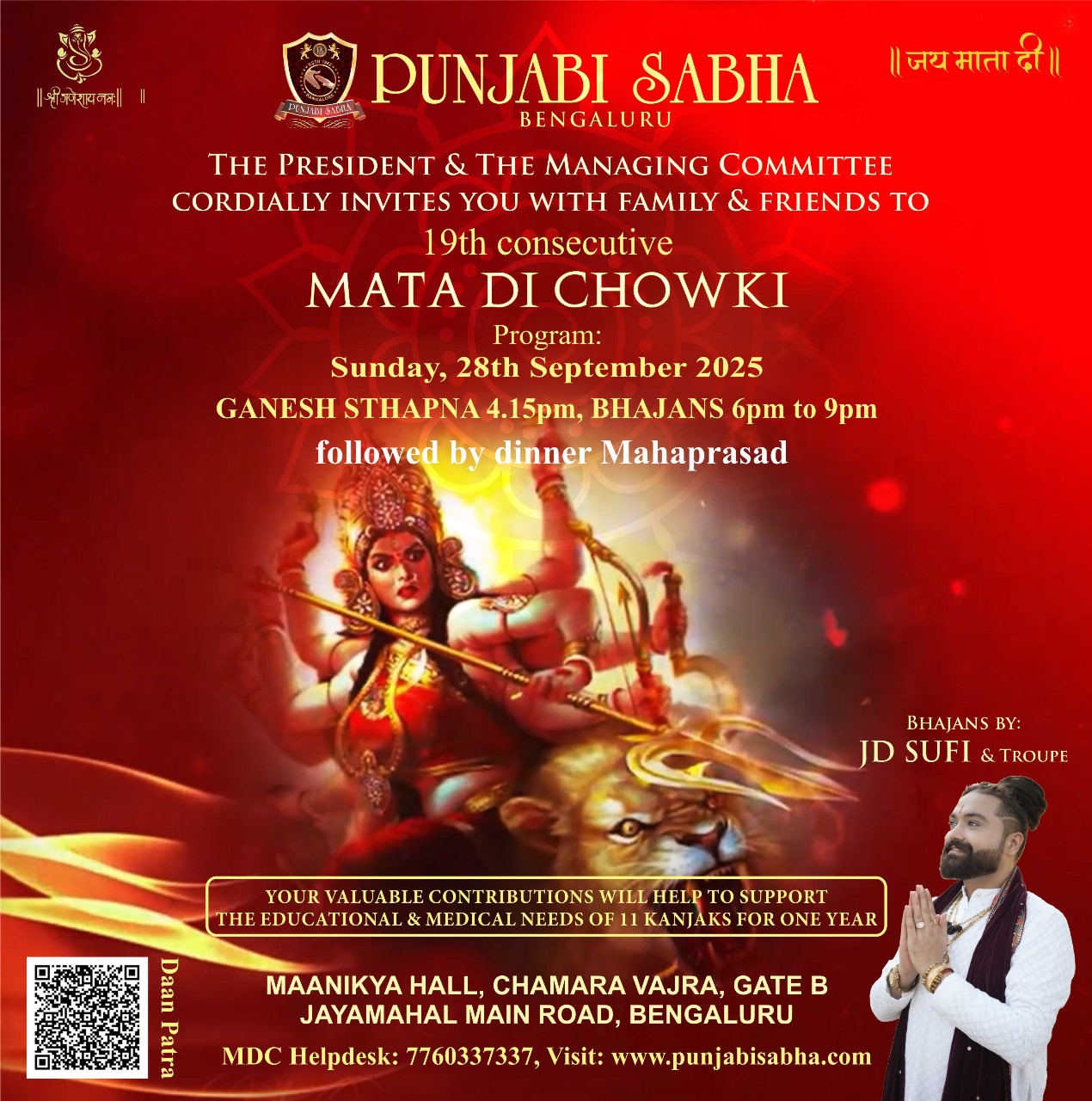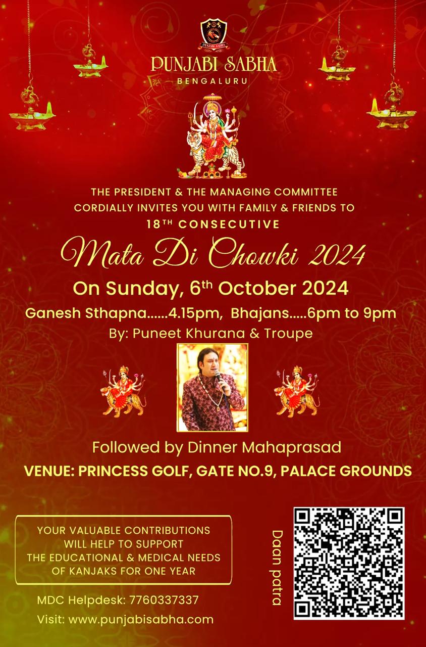 Punjabi Sabha, Bengaluru warmly invites you to its 19th Consecutive Mata Di Chowki—an evening of divine devotion and community bonding. Immerse yourself in soulful bhajans by JD Sufi & troupe, experience the spiritual energy of Maa Durga, and join fellow devotees in prayer and celebration. The event will conclude with a heartfelt serving of Mahaprasad (dinner). Your participation also supports a noble cause, helping fund the education and medical care of 11 Kanjaks for an entire year. Come, be a part of this sacred celebration and receive Maa’s blessings.